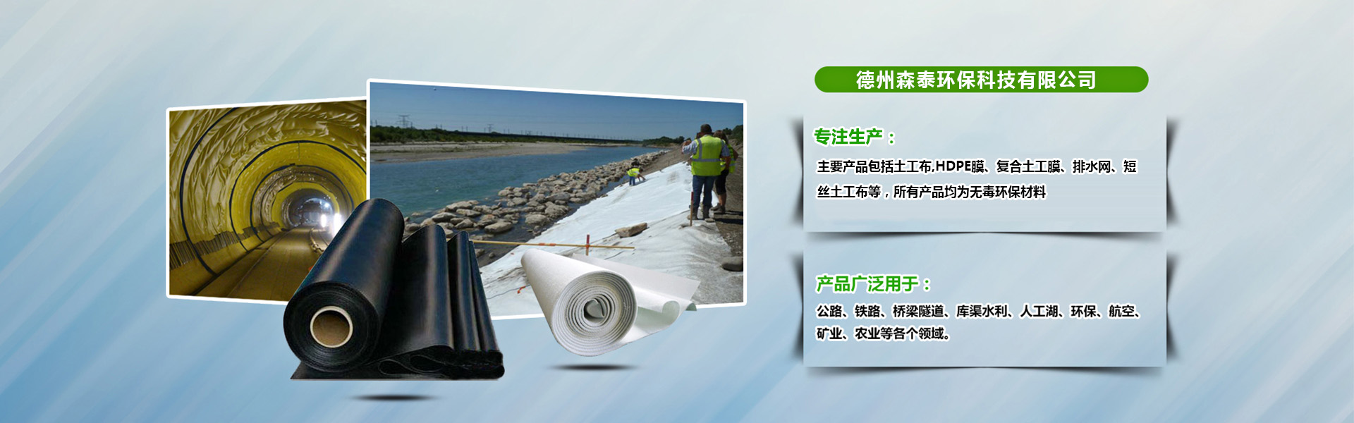 德州泰环保U技有限公司Q森泰环保专注于水利、环境及(qing)生态修复技术研发及(qing)产品刉,q有专业的施工工E技术服务团队。已完成水利工程100多项Q环境工E?00多项Q典型工E包括南水北调工E、三峡工E、߀沱河防渗工程Q保定环城水pdE、济南垃圑֡埋场工程Q桂林垃圑֡埋场工程、大同电(sh)厂防渗工E、嘉兴火车站防渗工程、黑龙江农垦防渗工程{。森泰环保主要品包括土工布,HDPE膜、复合土工膜、排水网、短丝土工布{,所有品均为无毒环保材料,可广泛应用于Q?.环境修复工程Q粮食基地土壤改良、工业场地、矿业、水体等工程、蔬菜大?LQ种植等Q?.水利工程Q江x(chng)库、堤坝的防渗加固、水渠的防渗、护坡等Q及(qing)?jng)政防渗Q地铁、徏{物的地下工E、种植屋面、屋花园的防渗、污水管道内衬等Q?.....